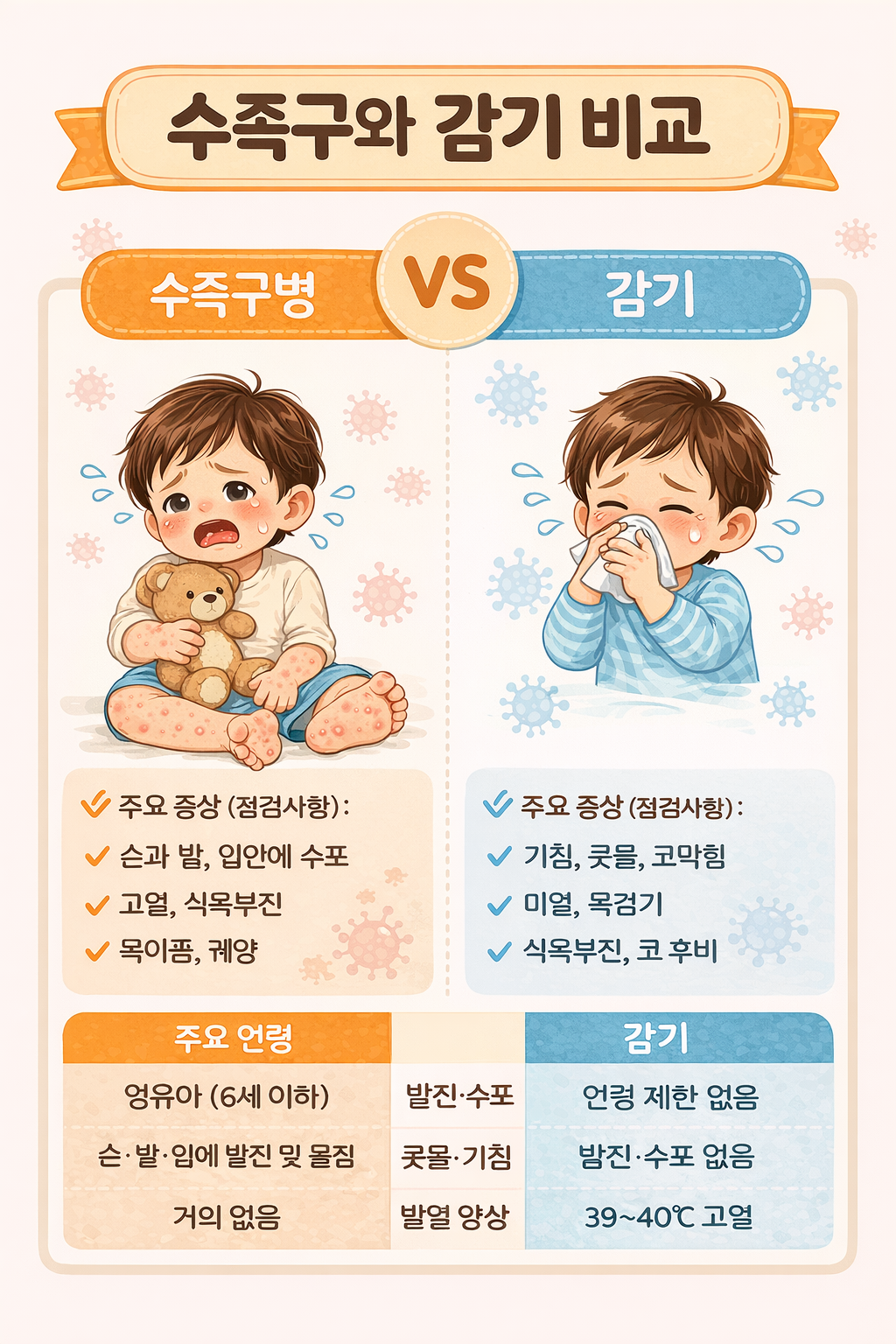 감기와 수족구는 초기 열과 기력 저하로 혼동되기 쉽지만, 입안 통증과 손발 발진이 함께 나타나는 경우 수족구를 의심해야 합니다. 감기는 빠르게 회복되고 전염 기간도 짧은 반면, 수족구는 전염력이 강하고 회복이 느리며 격리 관리가 필요합니다.