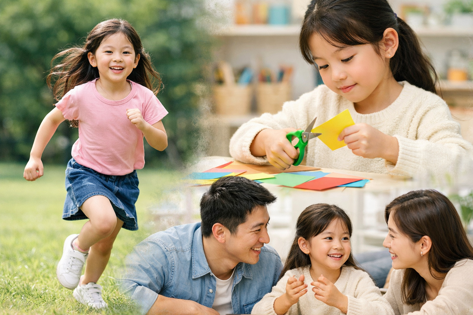 25~36개월 시기의 가장 두드러진 특징은 신체조절능력의 비약적인 성장입니다. 두 돌 이전에는 누워만 있던 아이가 앉고, 기고, 서고, 걷는 식으로 커다란 움직임의 변화가 일어났다면, 이제는 뛰면서 속도를 조절하고 이동 속도가 빨라지며 이동 범위가 넓어지는 식으로 발달이 이루어집니다. 단순히 걷는 것을 넘어서 뛰기, 달리기, 점프하기 등의 동작이 가능해지며, 이 과정에서 균형성과 평형성이 생깁니다.